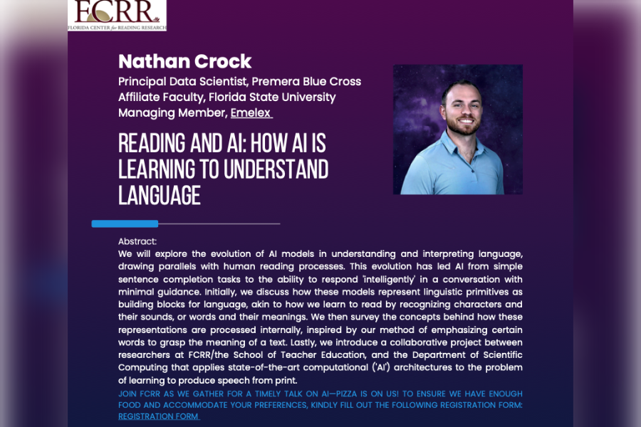 In this talk, we explored the evolution of artificial intelligence (AI) in understanding and interpreting language, drawing parallels with human reading processes. Initially, we discussed how AI breaks down language into manageable segments, similar to how we learn to read by recognizing words and their meanings. We then delved into how AI focuses on key elements in sentences, reflecting our own method of emphasizing certain words to comprehend the meaning of a text. This evolution has allowed AI to progress from simple sentence completion to responding intelligently with minimal guidance, demonstrating its growing sophistication in language comprehension. A significant portion of the presentation was dedicated to a collaborative project between FCRR and the Department of Scientific Computing, which aimed to develop an AI model for reading. This model was designed to interpret not only the visual aspect of words but also their phonetic characteristics, mimicking the way humans process written and spoken language simultaneously. To conclude, we discussed recent AI concepts such as autonomous agents and considered the impact of technological advancements on the field of reading and language research.