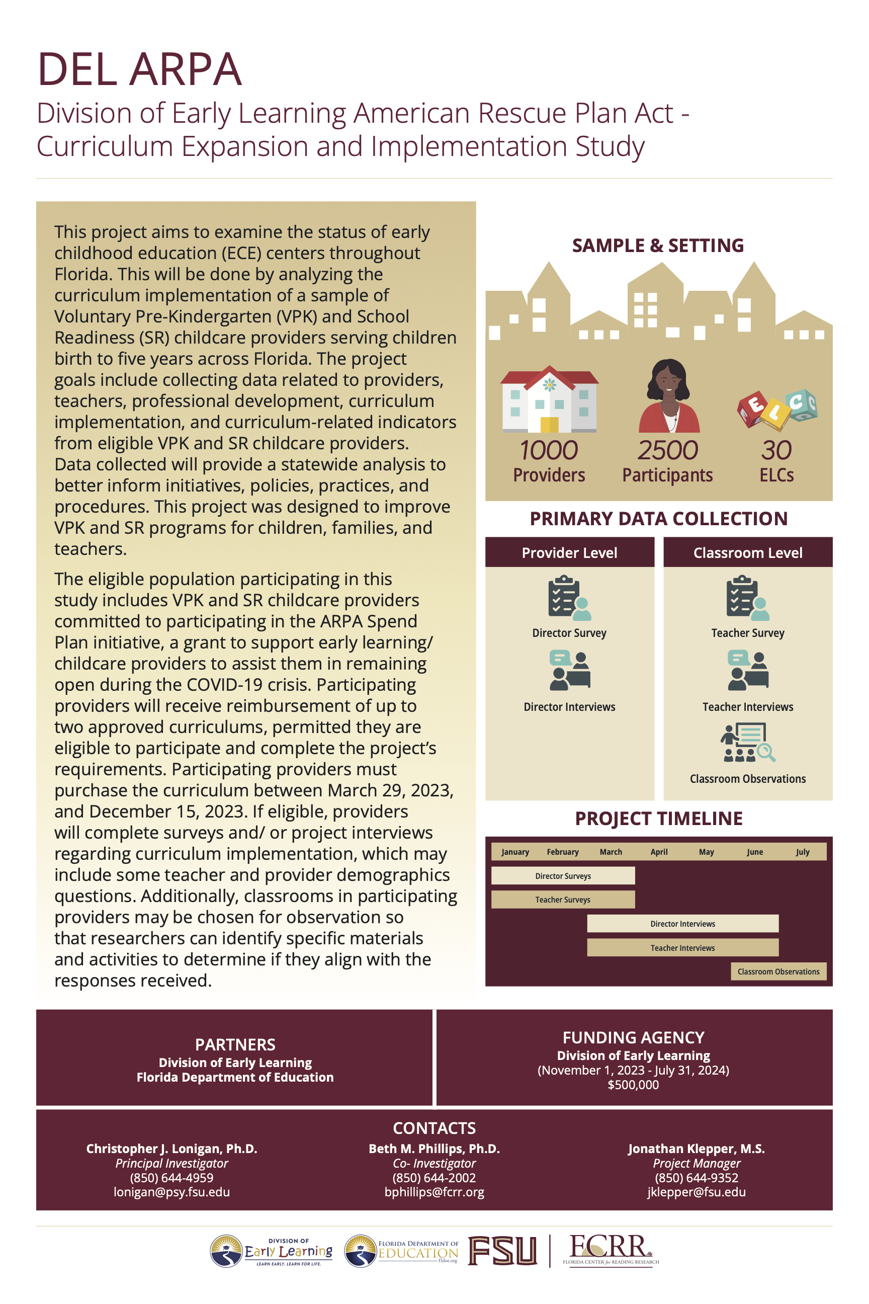 The eligible population participating in this study includes VPK and SR childcare providers committed to participating in the ARPA Spend Plan initiative, a grant to support early learning/childcare providers to assist them in remaining open during the COVID-19 crisis. Participating providers will receive reimbursement of up to two approved curriculums, permitted they are eligible to participate and complete the project’s requirements. Participating providers must purchase the curriculum between March 29, 2023, and December 15, 2023. If eligible, providers will complete surveys and/ or project interviews regarding curriculum implementation, which may include some teacher and provider demographics questions. Additionally, classrooms in participating providers may be chosen for observation so that researchers can identify specific materials and activities to determine if they align with the responses received.