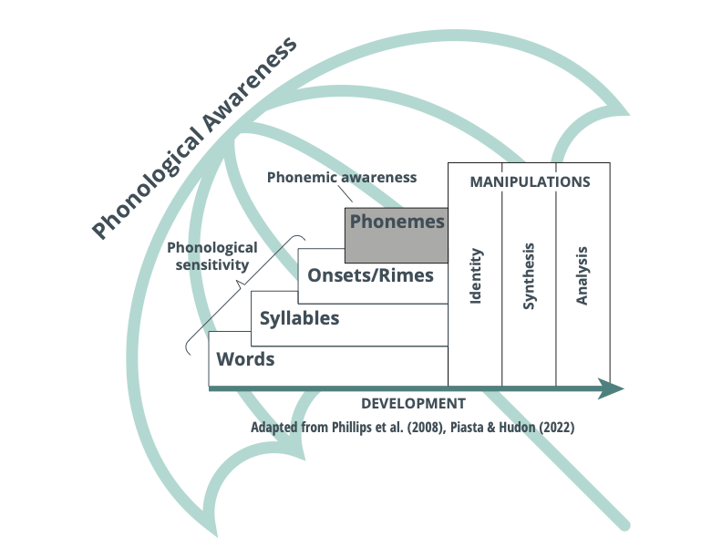 Phonological Awareness is an “umbrella term” referring to the ability to hear and manipulate sound units in speech. It is represented in educational curricula and learning standards across the country. Decades of research on the science of reading have established that phonemic awareness – the part of phonological awareness specifically about hearing and manipulating individual speech sounds – is a critical component for literacy learning.