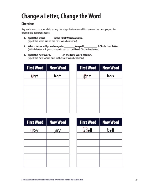 Word-changing activities can be used to help support your child's learning to read and spell. Word changing activities include using letters in which you know the sounds to build a word. Then, you change a letter or letters to change the word. Word changing can be fun for children and helps them become better spellers and readers.