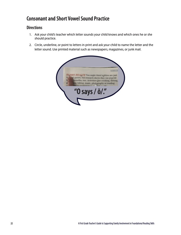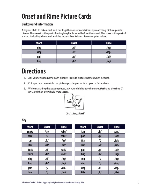 These Family Activities include easy-to-follow plans to help you support your child's foundational reading skills at home. Materials needed for each Family Activity, such as letter cards, are included. They begin with simpler activities and progress to more difficult ones. You may want to start with the first activity and move to the next when you notice that your child has a firm understanding of the content from that activity. We encourage you to select appropriate activities for your child, and feel free to set aside anything that seems too difficult. The goal is to engage your child in activities that promote learning in a positive environment, not to induce frustration. The activities should be completed with the child, frequently, with patience, and positive feedback. Using the activities at home will be a fun way to spend family time together!