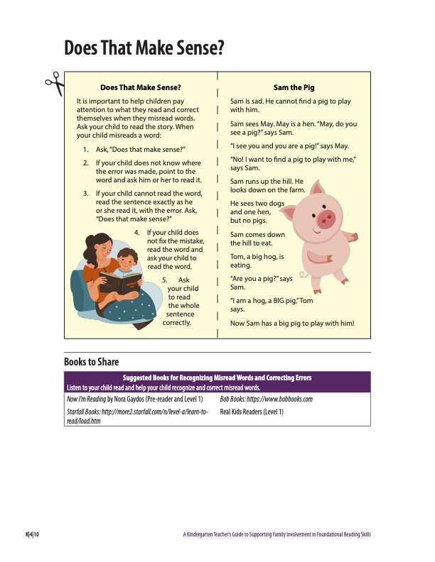 Families can help children monitor what they read and make corrections when words are misread. As you read to your child, you can provide examples of how to recognize when words are misread by "thinking out loud." You can say things like, "That didn't make sense. I'm going to read that sentence again." When your child reads to you and misreads a word, ask her to stop and see if she can correct the error. If not, reread the sentence with the missed word exactly how your child read it and ask, "Did that make sense?" If your child does not self-correct, read the word and have her reread it. Then have her read the sentence correctly.