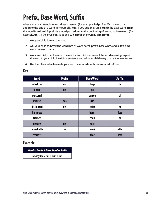 Help your child break words into common word parts (base words, prefixes, suffixes) to practice reading and spelling longer words.