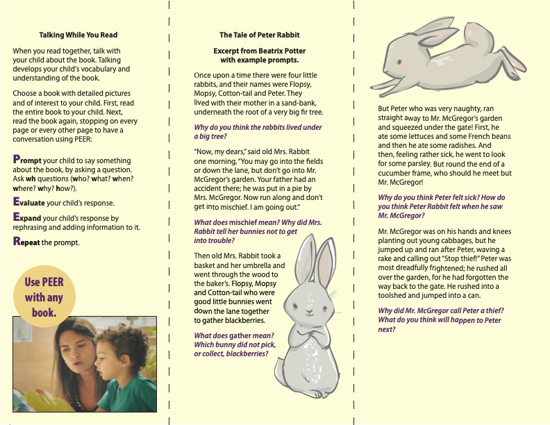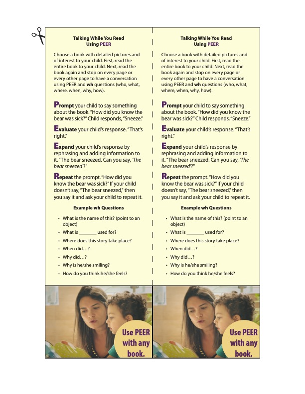 The Talking While You Read Trifold includes an overview of how to use PEER. There is also a story with questions placed where they are most helpful to prompt your child. Remember to read the story through one time first with your child. On the second read, use PEER as you ask each question.
