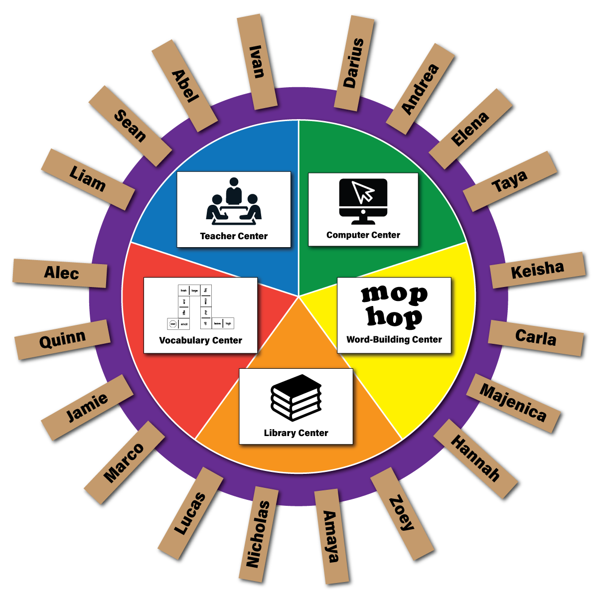 This center management visual is a rotation wheel which consists of two circles—one large and one smaller. Student names are on clothespins and placed in groups on the larger laminated circle. Student clothespins may be moved as groups change. Using Velcro, center icons are placed on the smaller laminated circle and may be replaced as centers change. Turn the larger wheel to rotate centers. This example shows four centers including the teacher-led center.